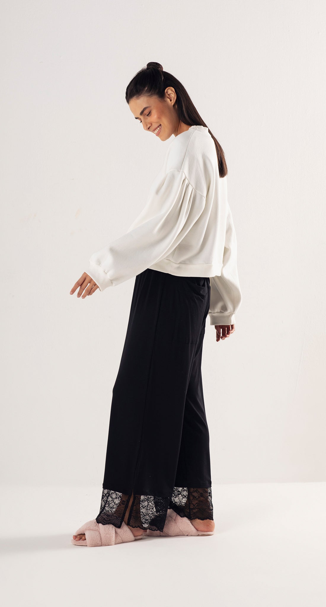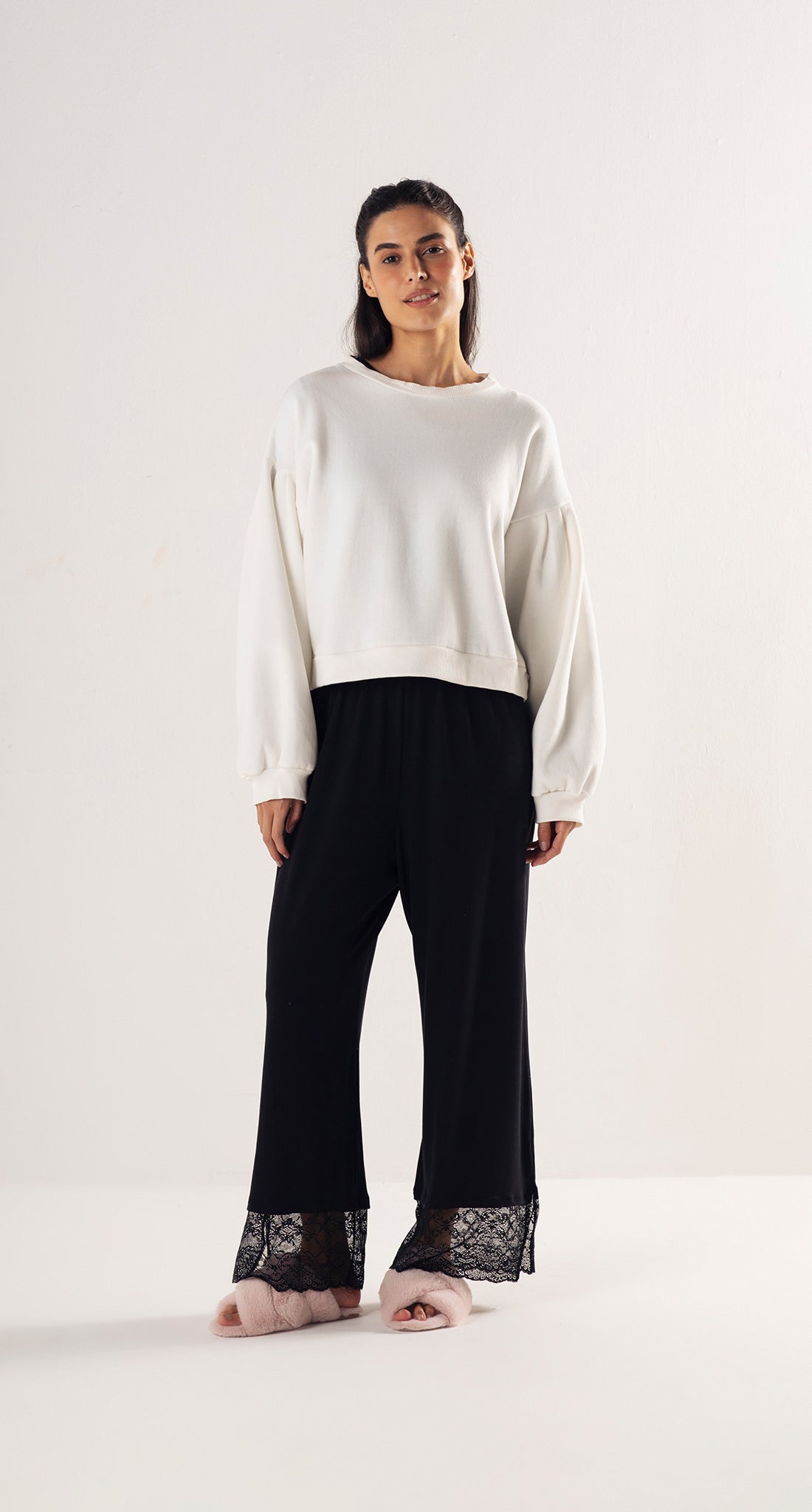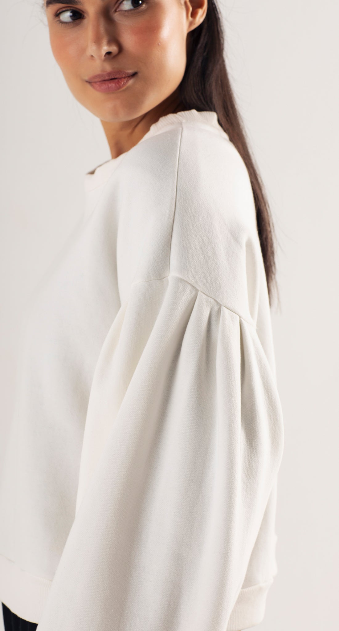 Confeccionado em tecido felpudo, proporciona uma deliciosa sensação de maciez e aconchego. O modelo possui gola redonda, caimento soltinho e um charme especial: mangas bufantes com pregas delicadas, que adicionam um volume sutil e elegante ao visual.
