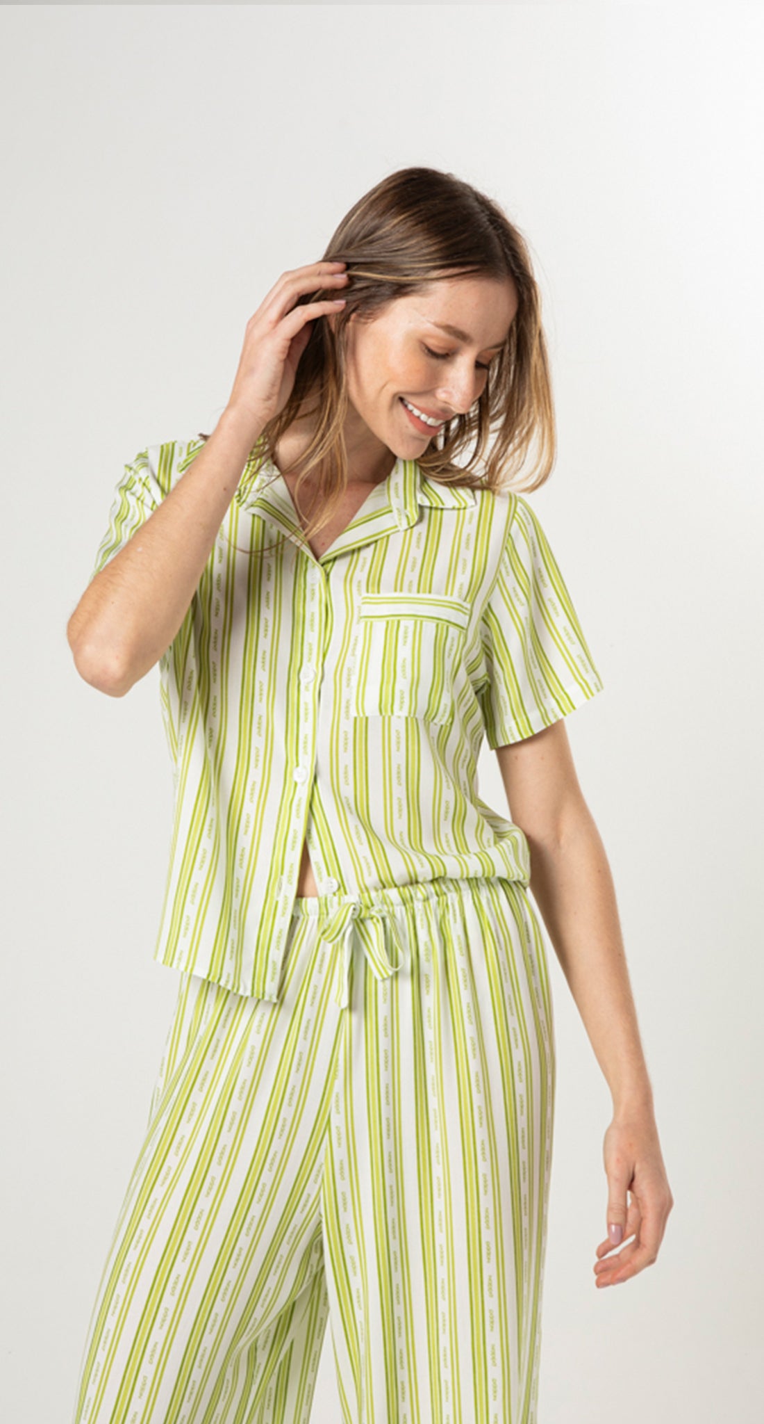 Pijama com blusa de manga curta, gola e abertura frontal por botões. Possui bolso funcional na parte superior e modelagem confortavel ao corpo.