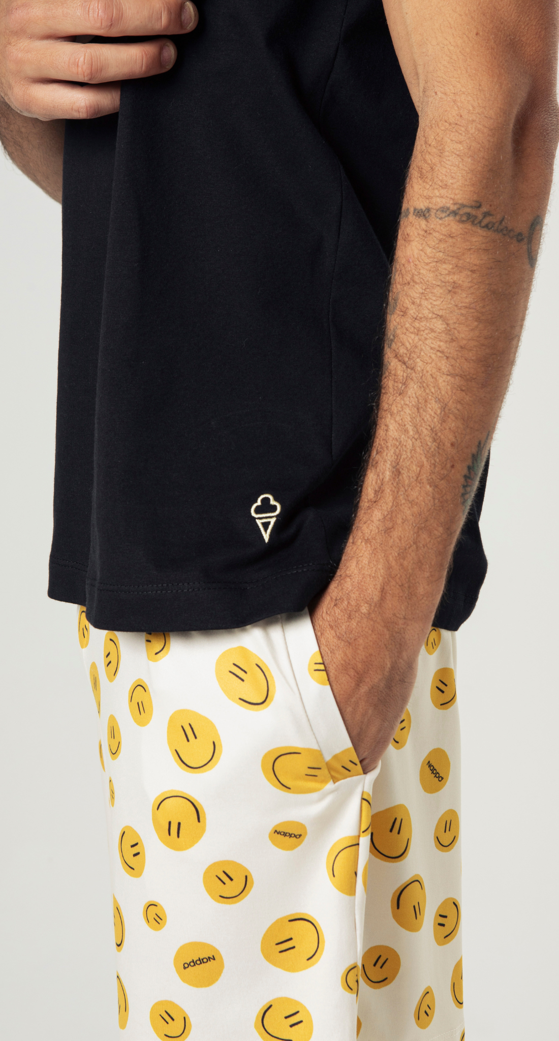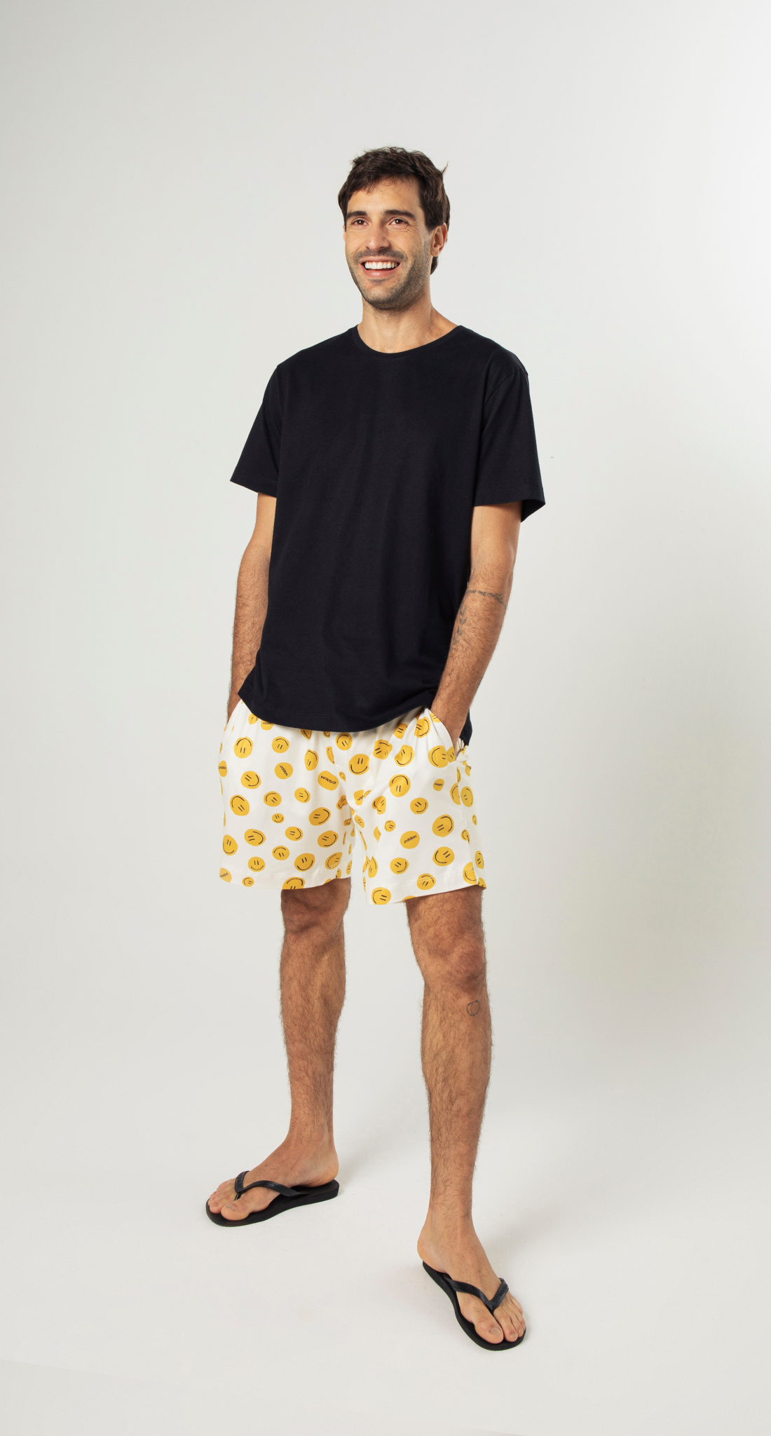 O shorts traz nossa estampa exclusiva sorrisos, com modelagem soltinha e cós de elástico. Possui bolso lateral.