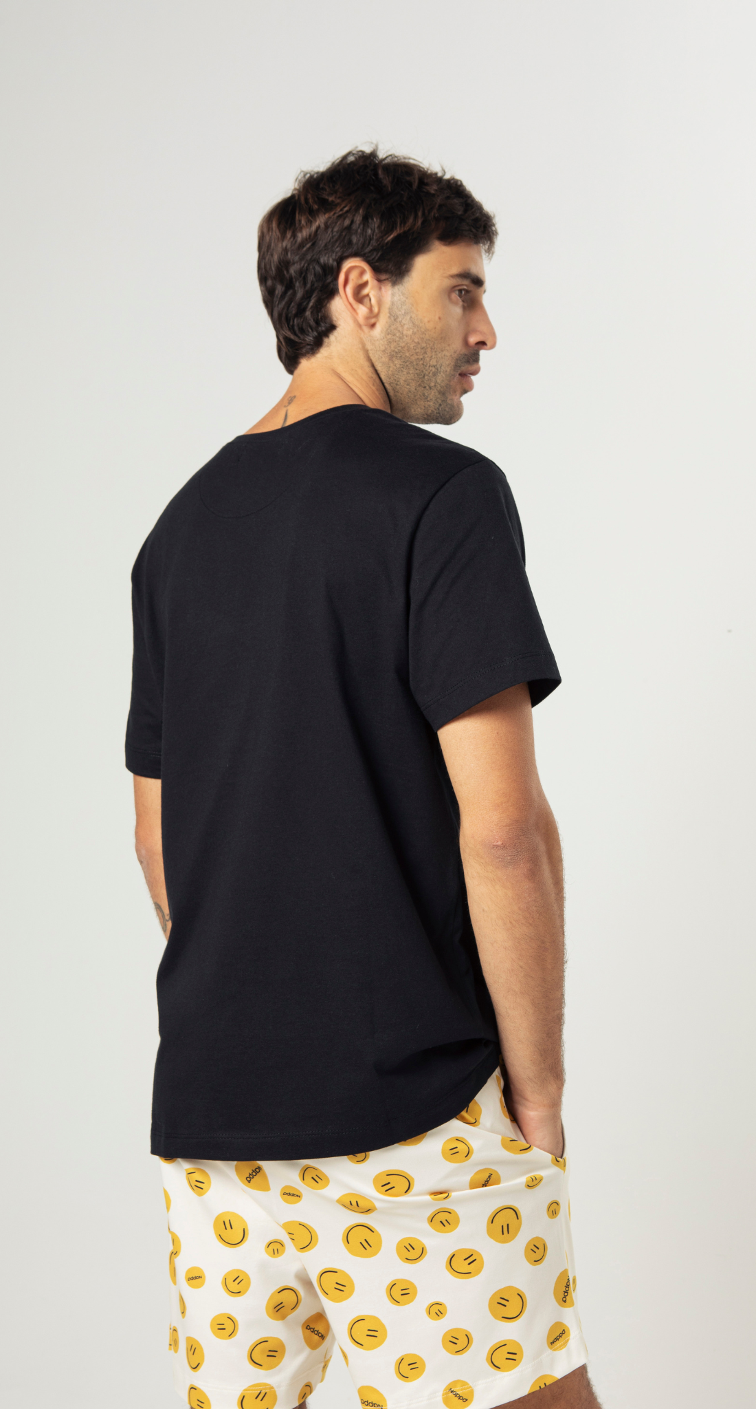 A camiseta preta de modelagem básica é versátil e atemporal, contém o detalhe especial o bordado do sorvete — símbolo da Nappô — na barra.