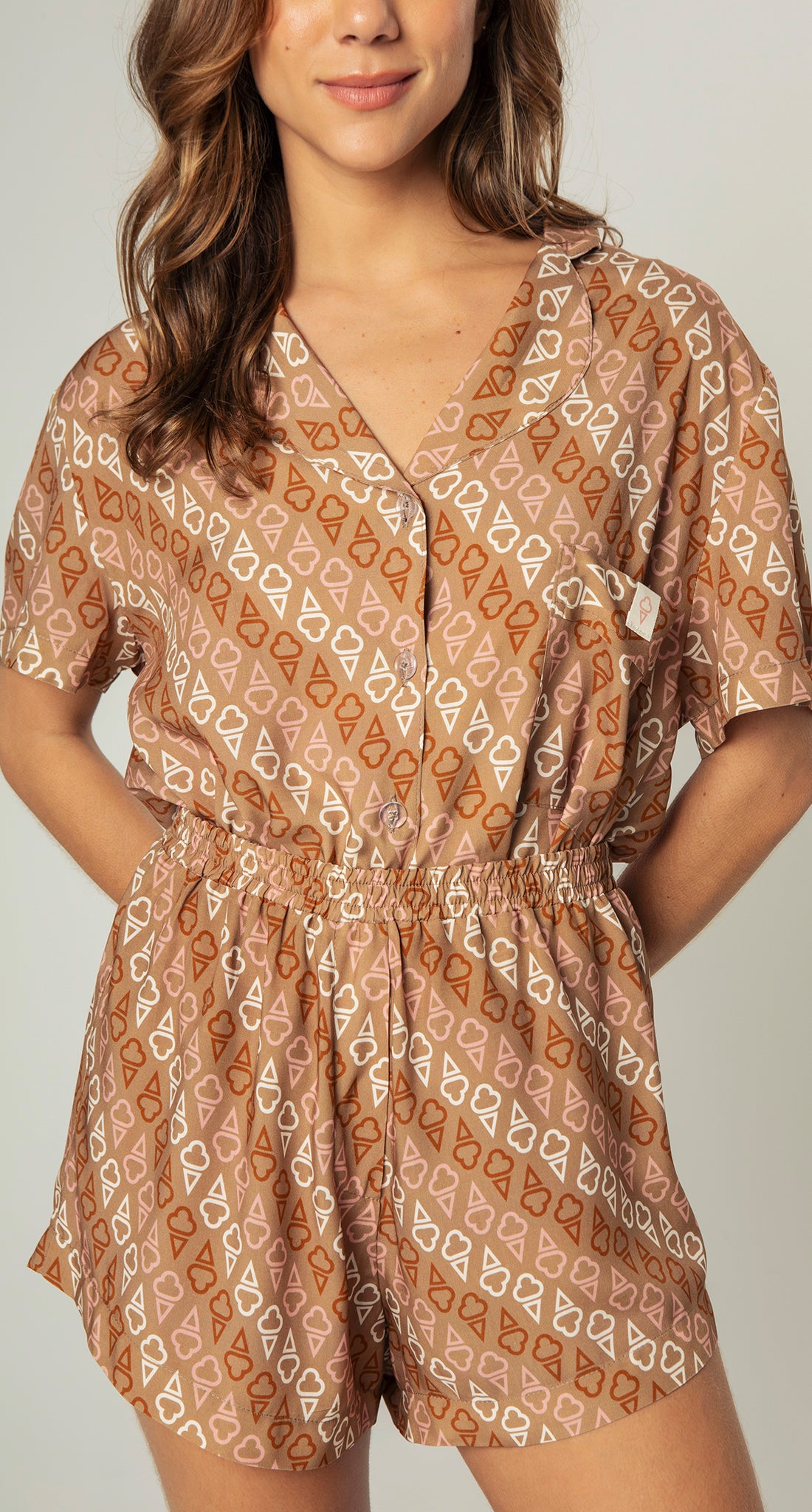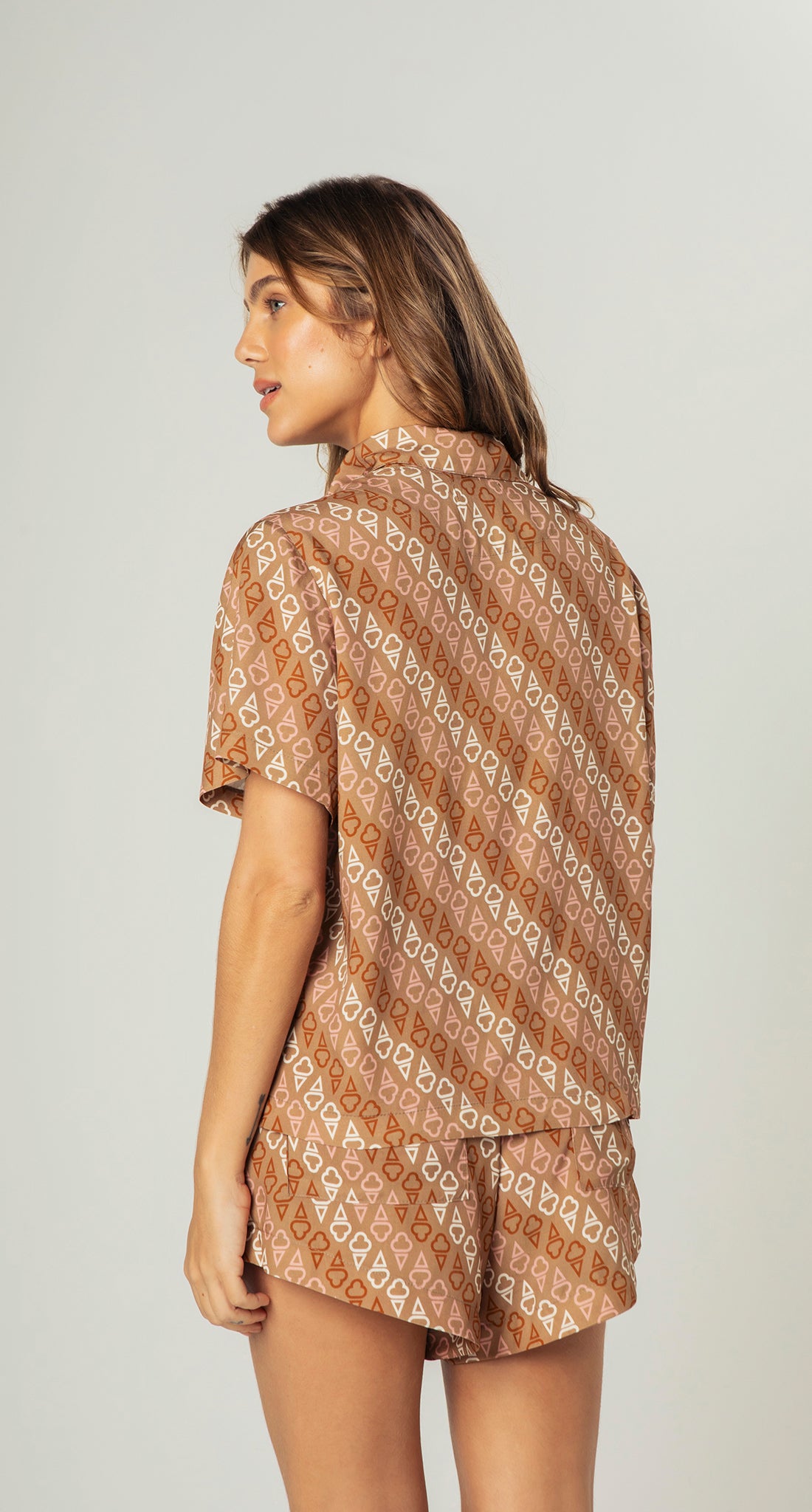Composto por camisa de manga curta, gola clássica e fechamento por botões, além de short com modelagem soltinha