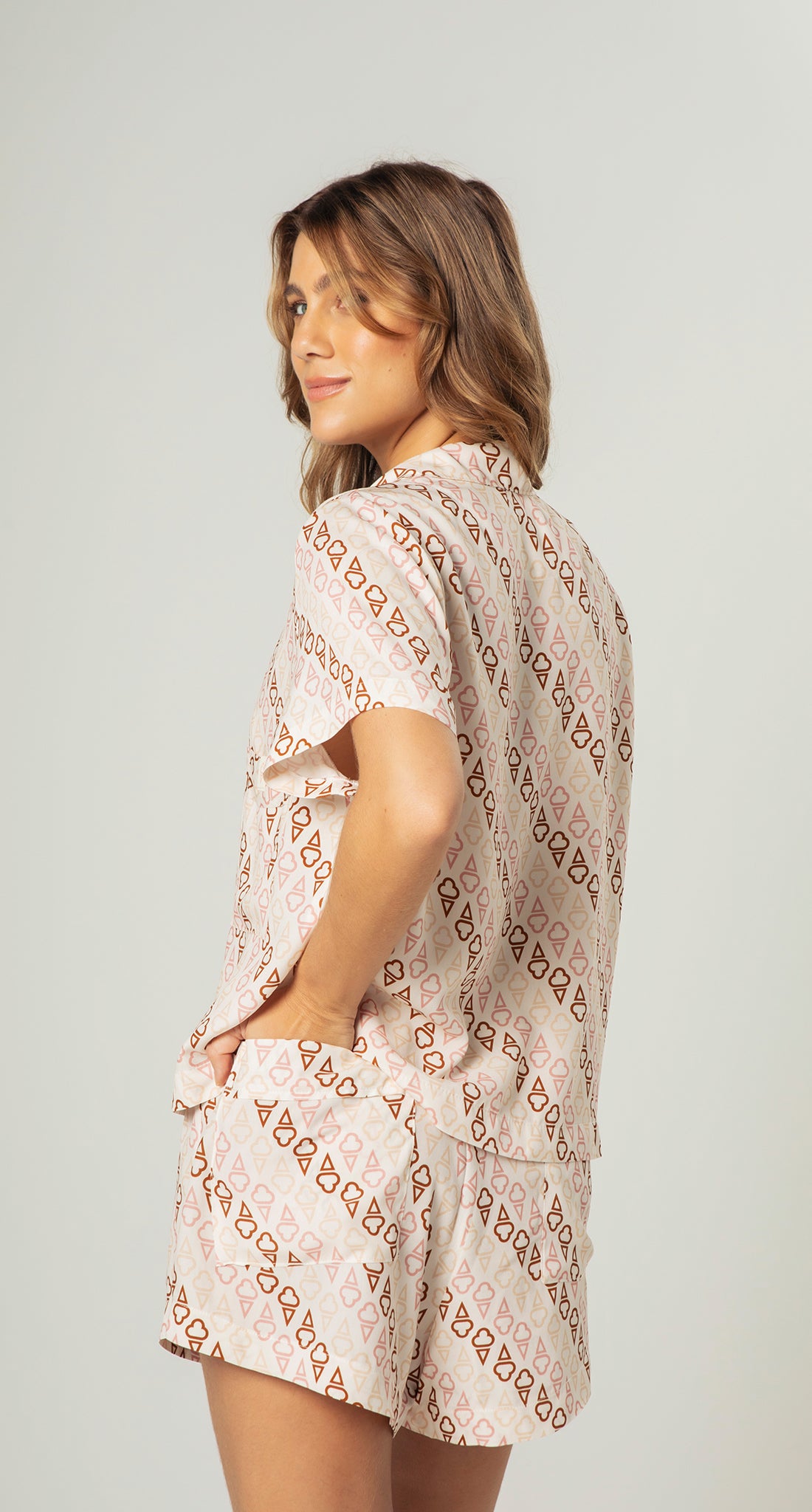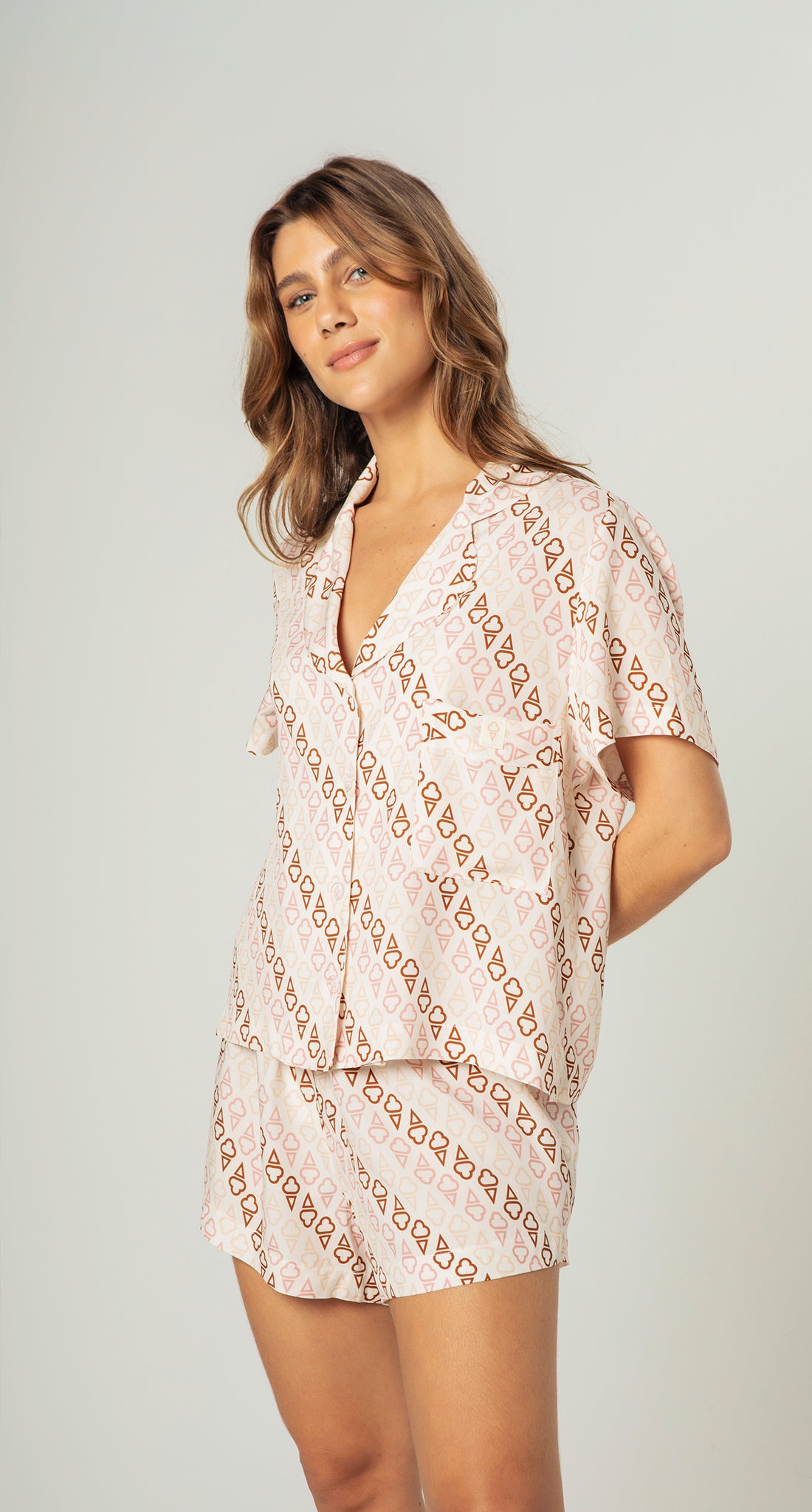 Composto por camisa de manga curta, gola clássica e fechamento por botões, além de short com modelagem soltinha