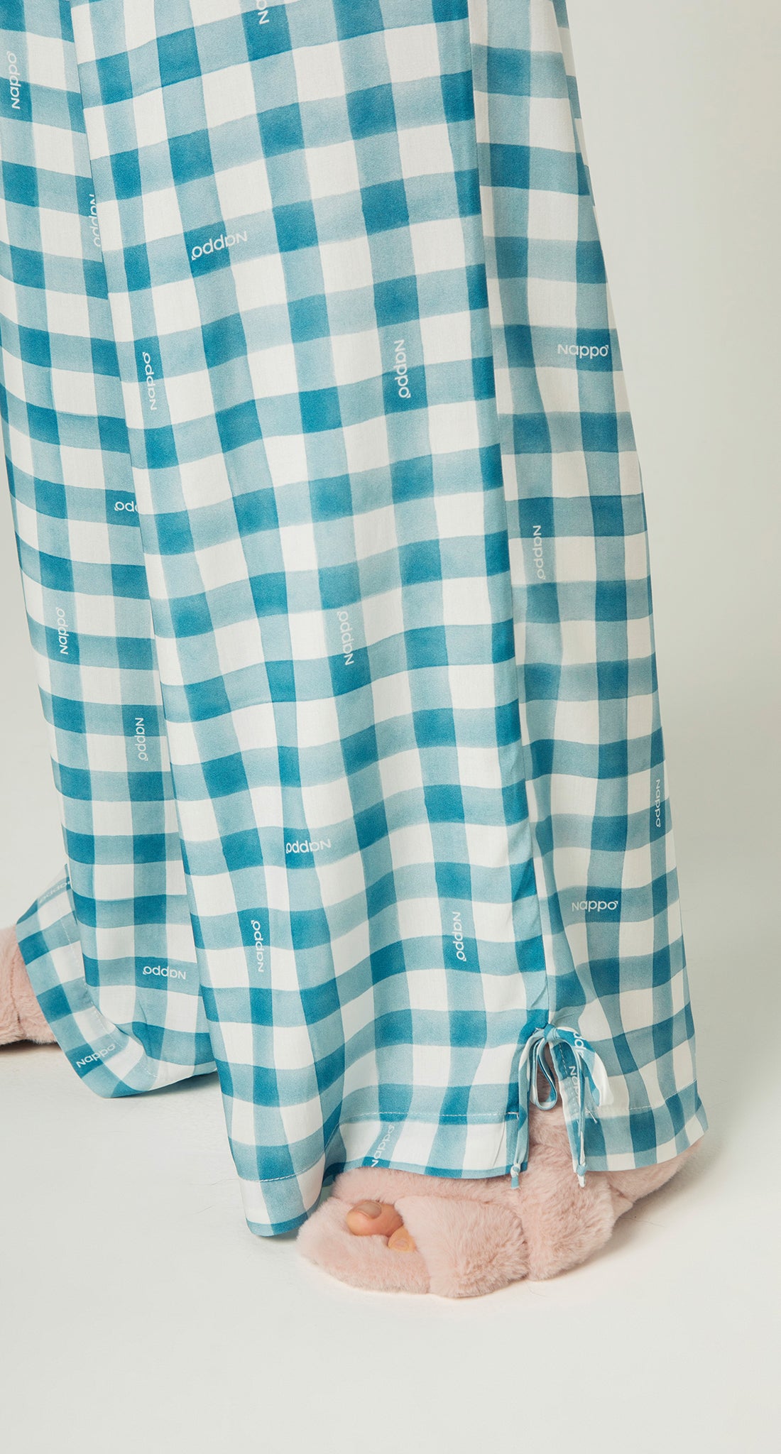 A calça segue a mesma proposta, com estampa coordenada, cintura de elástico ajustável e caimento reto e fluido. Na barra, laços laterais complementam o design, adicionando charme e feminilidade ao conjunto.